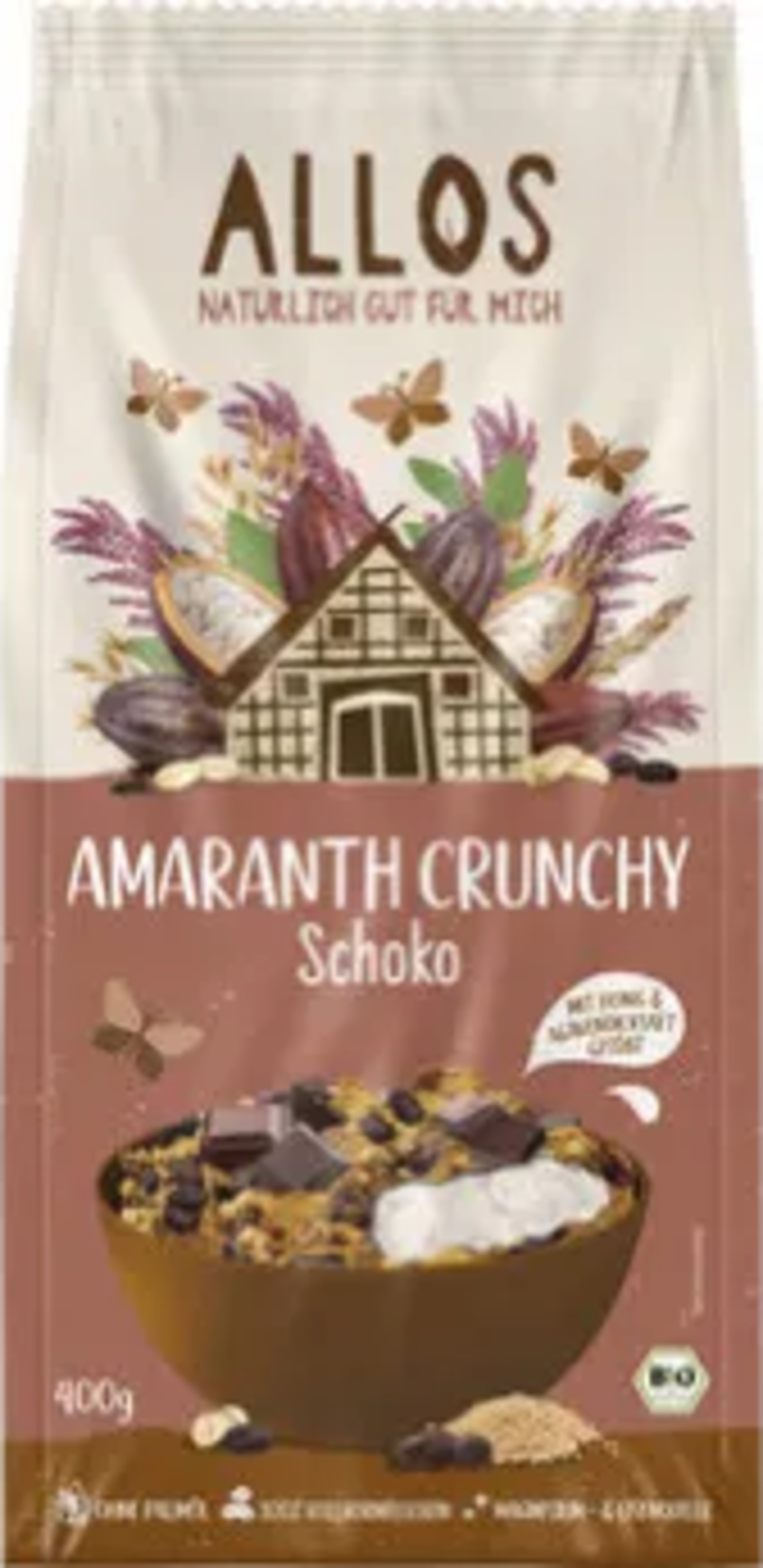 Volkoren havervlokken[1], 10 % amaranthcornflakes[1], maïs[1], 28 % volkoren amarant[1], 5 % honing[1], Glukosesirup[1], Meersalz, 8 % pure chocolade[1], Cacaomassa[1], rohrzucker[1], cacaoboter[1], 8 % agavesiroop[1], rijst siroop[1], volkoren amarant (gepoft en gemalen) (6%)[1], rijstcrispies (gemalen rijst)[1], aardappelzetmeel[1], zonnebloemolie[1], lijnzaad[1], volkoren speltmeel (tarwesoort)[1], sesam[1], Meersalz, antioxidant (extracten met een hoog tocoferolgehalte)