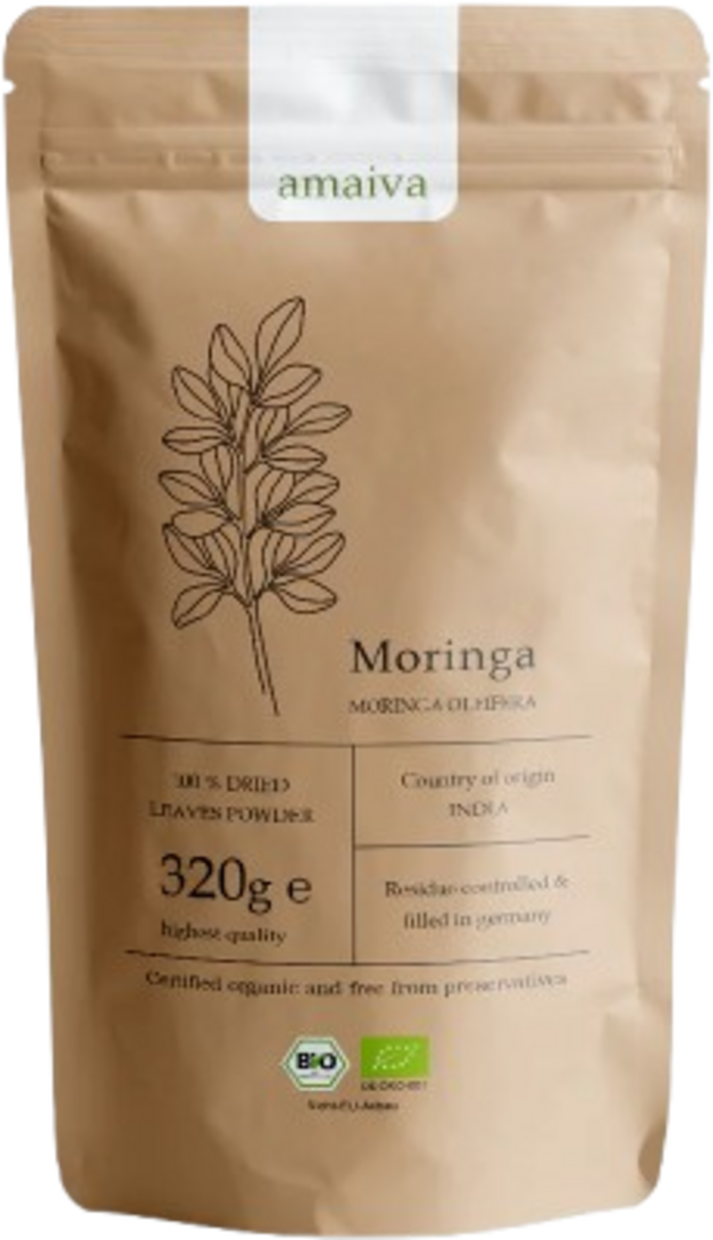 Het moringapoeder bestaat uit natuurlijk gedroogde bladeren van de Moringa Oleifera boom uit biologische teelt in India. De bladeren worden vroeg in de ochtend geoogst, voordat de zon de grondstoffen kan aantasten. De verse bladeren worden vervolgens gewassen en in de schaduw gedroogd bij een constante temperatuur. Door deze traditionele bewerking blijft het natuurlijke profiel van het bladmateriaal behouden. Het poeder is ideaal om een kruidensmaak toe te voegen aan eten en drinken.