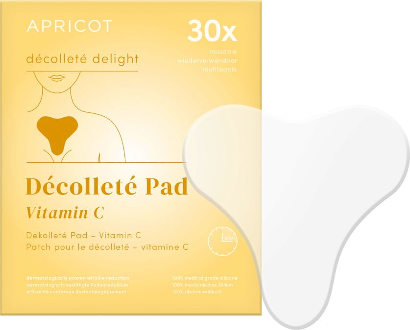 De Vitamin C Décolleté Pad van APRICOT biedt intensieve verzorging voor de gehyperpigmenteerde of door de zon beschadigde huid van het decolleté. De pad is gemaakt van siliconen van medische kwaliteit en is verrijkt met antioxidant vitamine C, dat helpt lijntjes en rimpels glad te strijken. Het kan tot 30 keer hergebruikt worden.