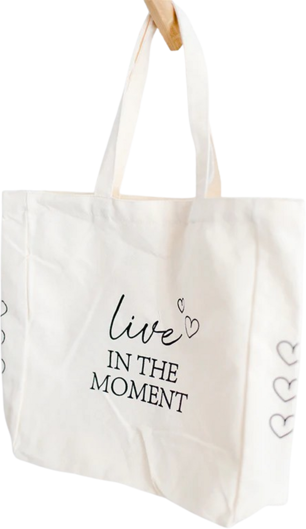 Deze robuuste en liefdevol bedrukte katoenen tas met lange hengsels en de opdruk "Live in the moment" zal je overal vergezellen. Hij biedt moeiteloos ruimte voor een waterfles, boodschappen, sportspullen of wat je maar wilt meenemen.