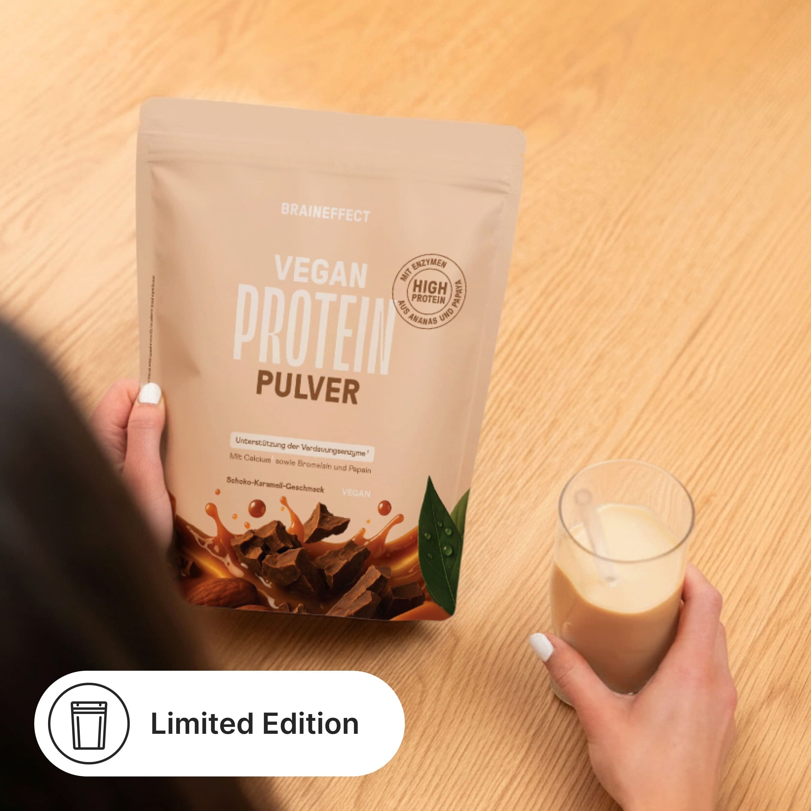 Het PROTEIN Powder van BRAINEFFECT is verkrijgbaar in 6 verschillende smaken. Eén portie bevat tot wel 23 g plantaardig proteïne en heeft een heerlijk romige smaak.