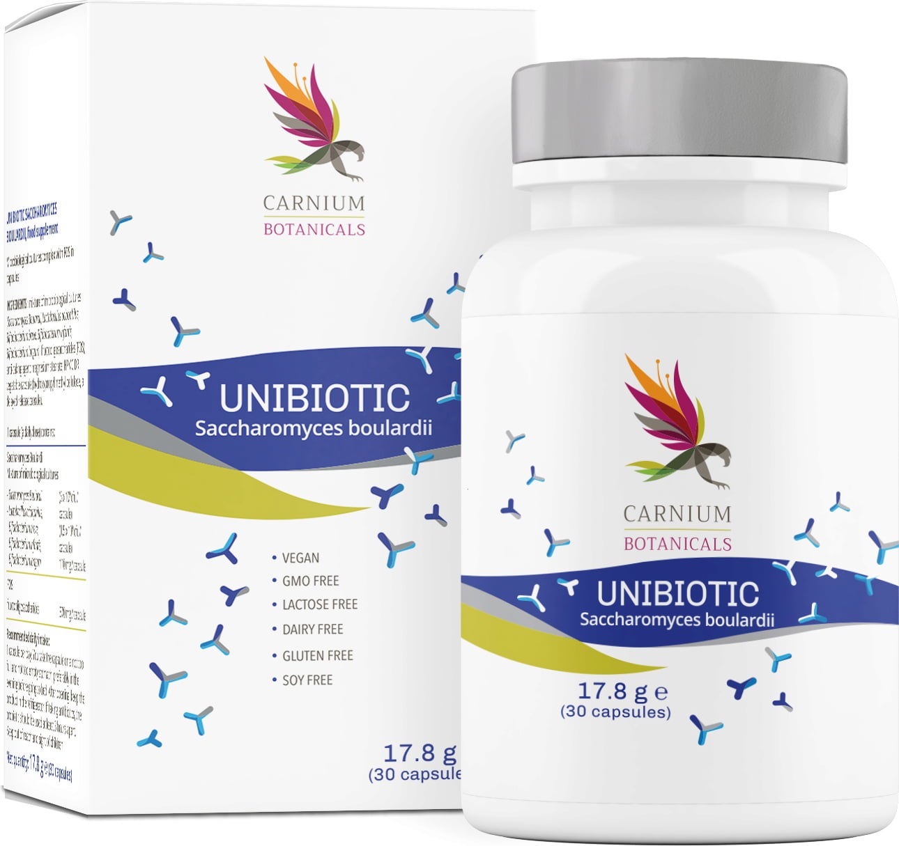De Unibiotic Saccharomyces Boulardii capsules van Carnium Botanicals bevatten microbiologische culturen, prebiotica en natuurlijke voedingsvezels. De capsules combineren Lactobacillus acidophilus, Saccharomyces boulardii, Bifidobacterium breve, Bifidobacterium infantis en Bifidobacterium longum met een prebiotische mix van oligosachariden en plantaardige inuline.