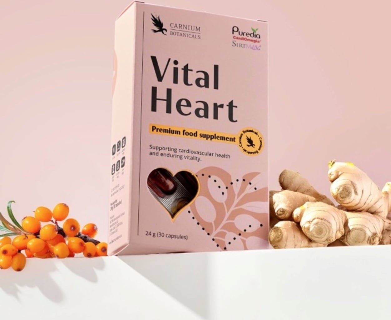 De formule is gebaseerd op zorgvuldig geselecteerde ingrediënten van plantaardige oorsprong, waaronder CardiOmegia™ duindoornolie, een natuurlijke bron van omega-7 vetzuren. De formule wordt aangevuld met het gepatenteerde zwarte gemberextract Sirtmax®, co-enzym Q10 en vitamine B1 en B2.