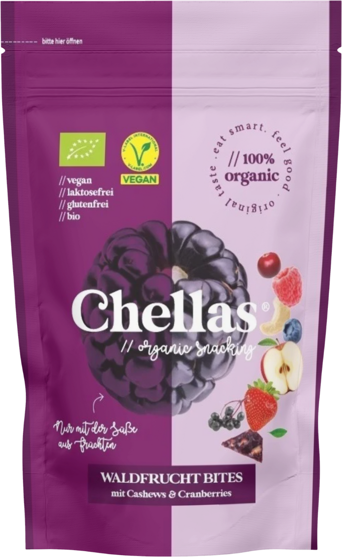De Biologische Bosvruchten Bites van Chellas brengen de volle kracht van bessen in een handige vorm: aardbeien, bramen, bosbessen, frambozen en vlierbessen mengen zich met knapperige cashewnoten en fruitige veenbessen om een intense smaakervaring te creëren. De zoetheid komt uitsluitend van het fruit - zonder kunstmatige toevoegingen, palmolie of suiker. Ze worden met liefde met de hand gemaakt in Oostenrijk en maken indruk met hun kwaliteit en natuurlijke smaak. Op kantoor, onderweg of op reis - het praktische vershoudzakje maakt Chellas het ideaal voor elke dag.