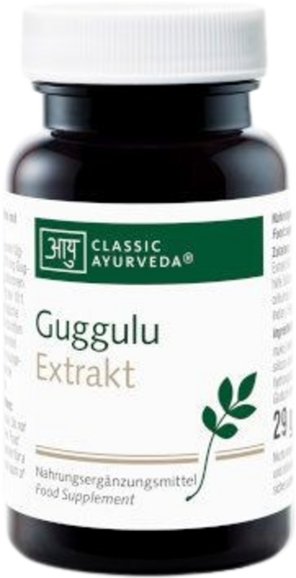 Dit product van Classic Ayurveda bevat een extract van Guggulu (Commiphora mukul). De capsules leveren per dagdosering 570 mg van het plantaardige extract, met daarin 15 mg guggulsteronen. Dankzij het extractieverhouding van 10:1 wordt een geconcentreerde vorm van de werkzame stoffen aangeboden in een plantaardige capsuleshuls van hydroxypropylmethylcellulose.