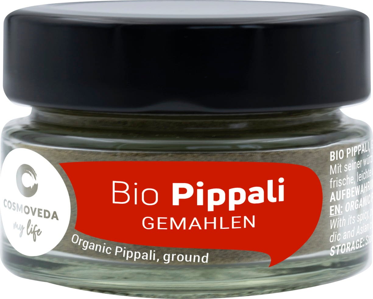 De pippali (lange peper) is een pittige zwarte peper die lijkt op een mengsel van kardemom, kruidnagel, nootmuskaat en peper.