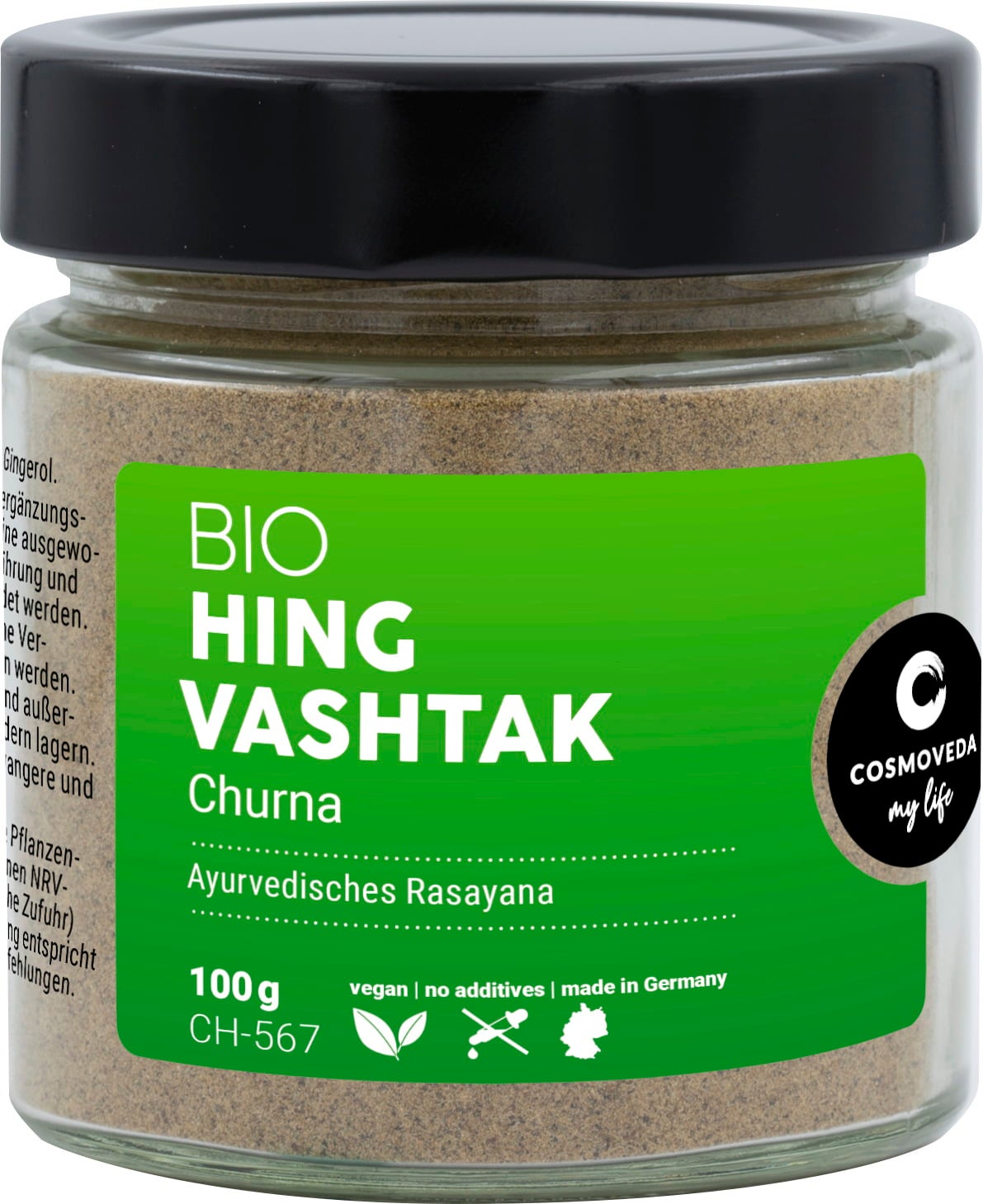 Bio Hingvashtak Churna is een Ayurvedische kruidenbereiding met ajwain, gember, zwarte peper, lange peper, komijn, zwarte komijn, zout, fenegriek en asfoetida.