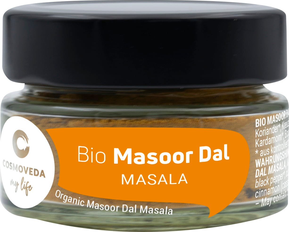 COSMOVEDA Bio Masoor Dal Masala is een speciaal uitgebalanceerde melange van Ayurvedische kruiden die heerlijke gerechten gemaakt van rode linzen (Masoor Dal) tot een succes maakt.