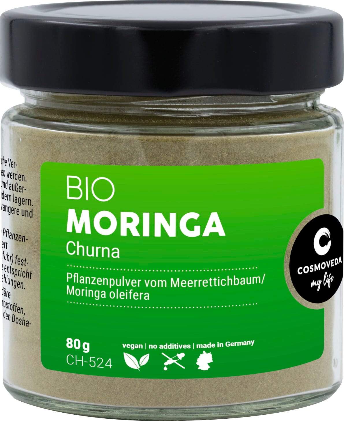 De bladeren die Cosmoveda gebruikt voor Bio Moringa Churna zijn afkomstig van Moringa oleifera, ook wel de "mierikswortelboom" genoemd, van Indiase en Sri Lankaanse fairtrade- en biologische projecten.