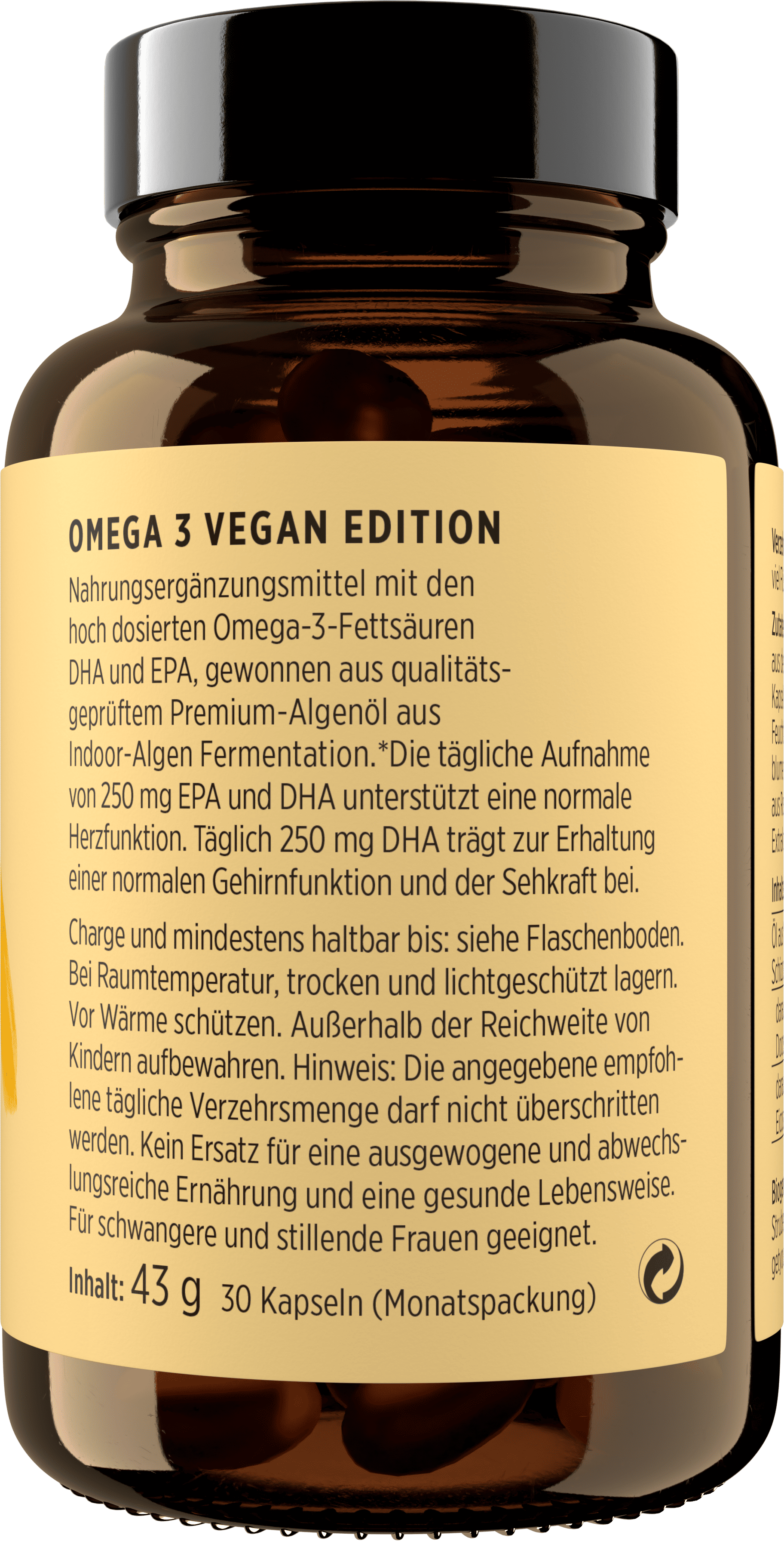 De OMEGA 3 VEGAN EDITION van vegan algenolie is rijk aan DHA en EPA. Dit natuurlijke mengsel is afkomstig van duurzame binnenkweek en biedt een perfect alternatief voor visolie.