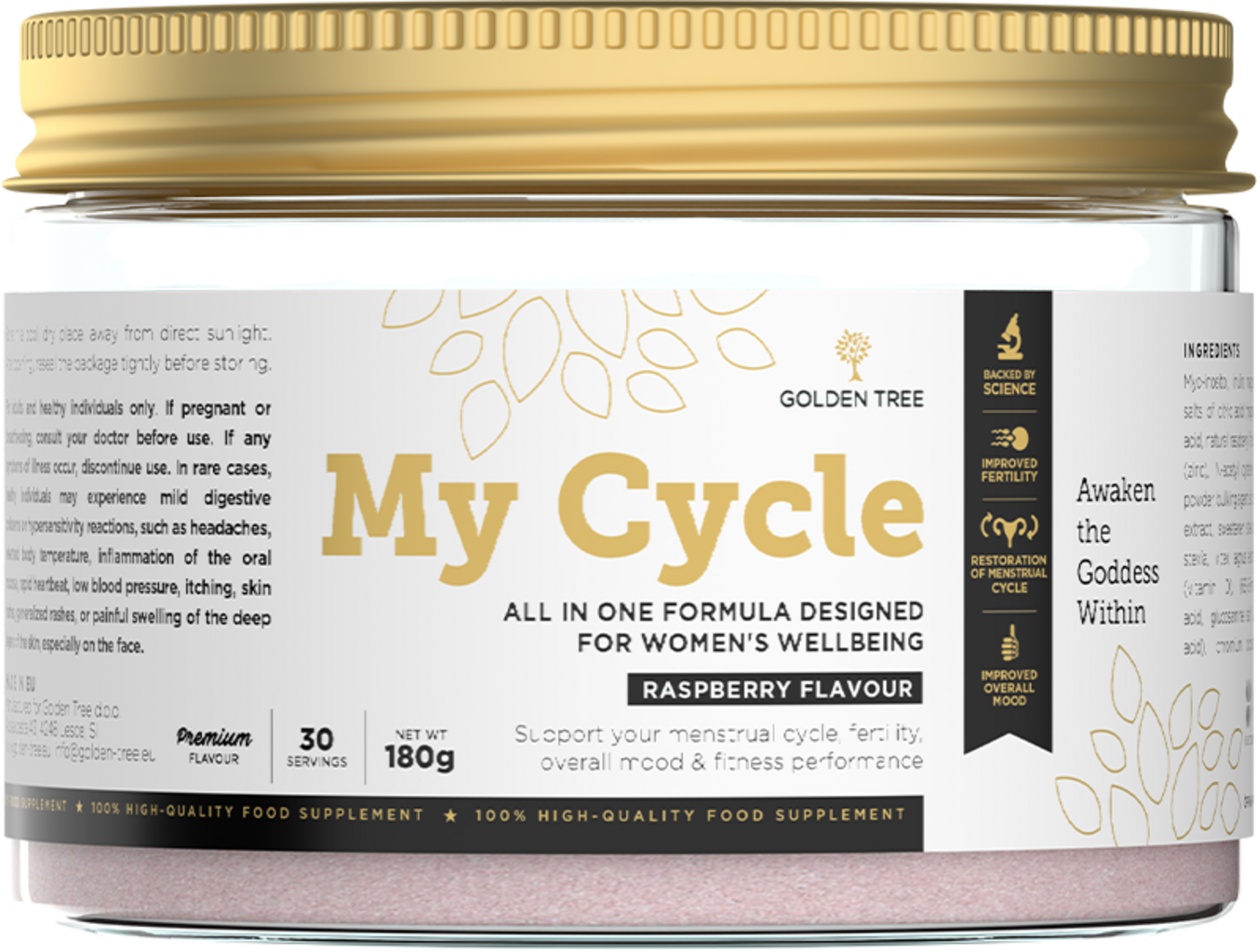 My Cycle van Golden Tree ondersteunt zelfbewuste vrouwen met foliumzuur, myo-inositol, magnesium, zink, chroom, vitamine D en inuline. Het poeder met natuurlijke smaakstoffen is gezoet met steviolglycosiden uit stevia en is heel gemakkelijk in te nemen - doorroeren, laten oplossen en genieten.