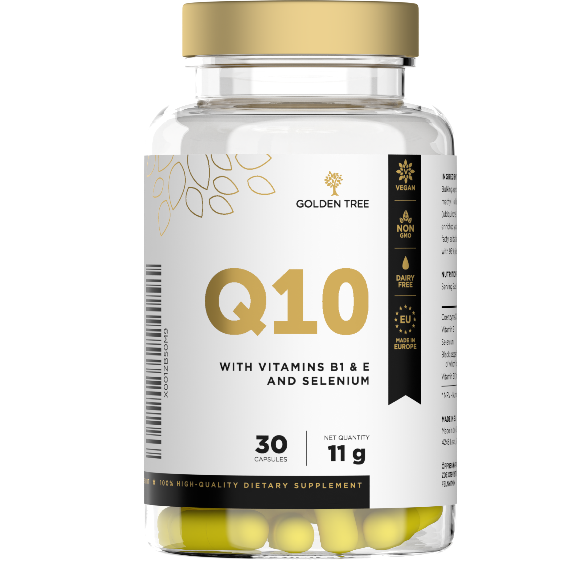 De Q10 capsules van Golden Tree bevatten elk 50 milligram van het belangrijke co-enzym. De vegan formule wordt aangevuld met vitamine B1, vitamine E, selenium en een hoogwaardig extract van de vrucht van de zwarte peper.