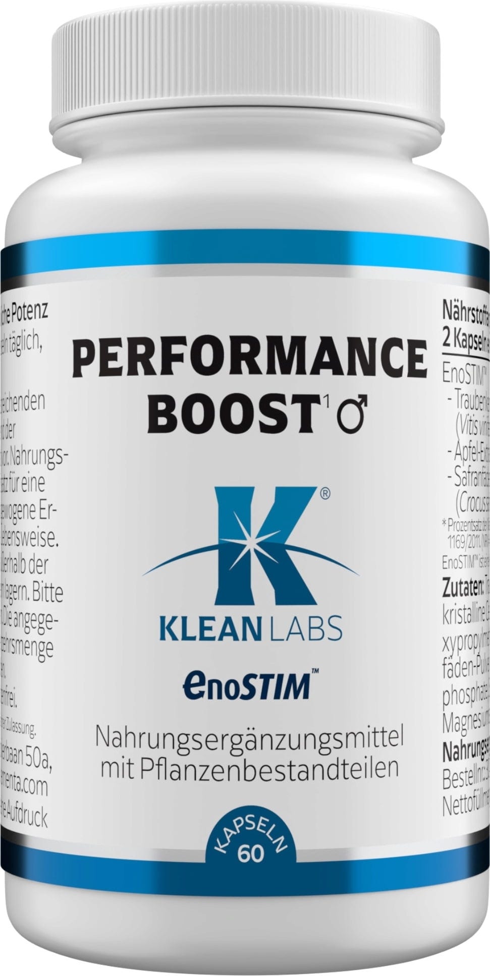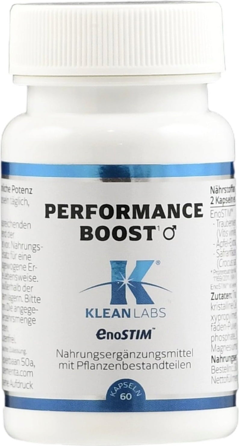 Performance Boost KLEAN LABS bevat de merkgrondstof EnoSTIM™, een combinatie van druivenpit- en appelpolyfenolen en poeder van saffraandraadjes. Dit voedingssupplement is specifiek gericht op mannen van 40 jaar en ouder. De formule is 100% vegan, GMO-vrij, glutenvrij en vervaardigd in de EU volgens GMP-normen.