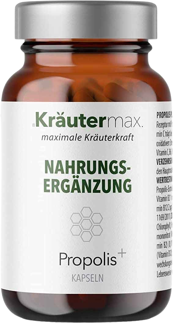 De Propolis+ capsules worden geproduceerd volgens het originele recept van Kräutermax en combineren propolisextract met de volgende vitaminen: vitamine C, vitamine B1, B2, B6, B12 en foliumzuur.