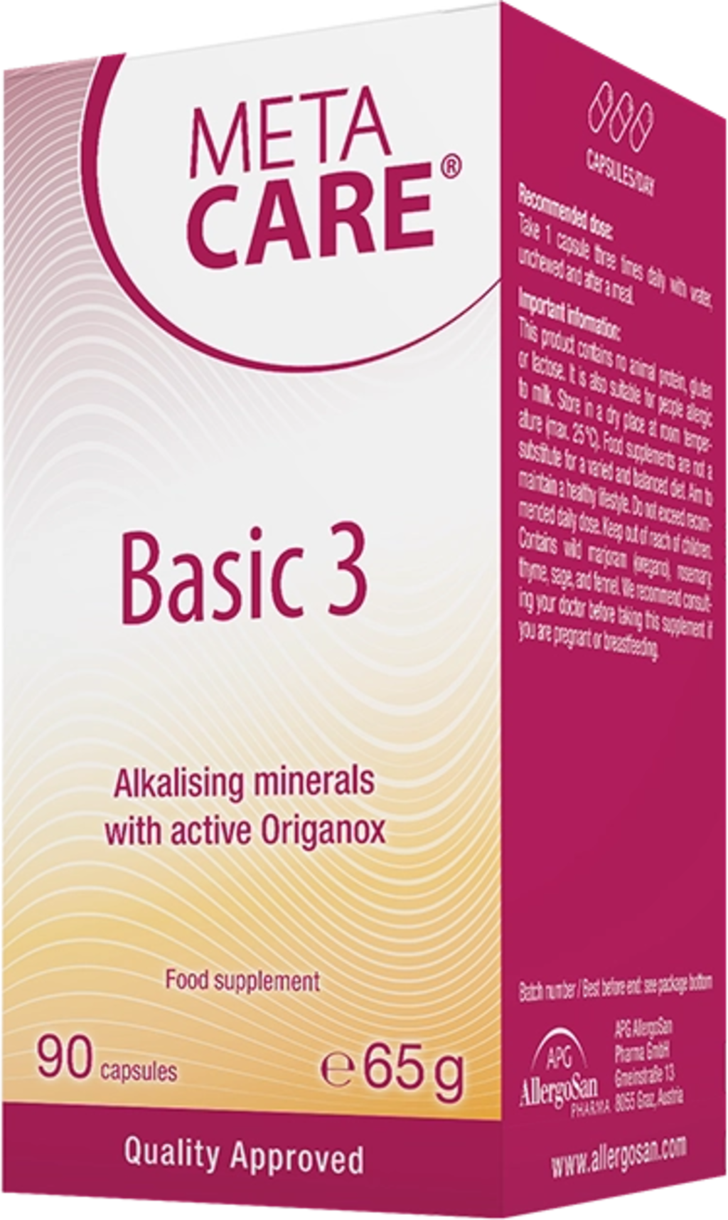 META-CARE® Basic 3 biedt je het trio van mineralen kalium, calcium en magnesium in capsulevorm. Daarnaast zijn de capsules verrijkt met waardevolle plantaardige stoffen uit oregano, rozemarijn, tijm, salie en venkel. De capsules zijn 100% vegan en vrij van genetische manipulatie.