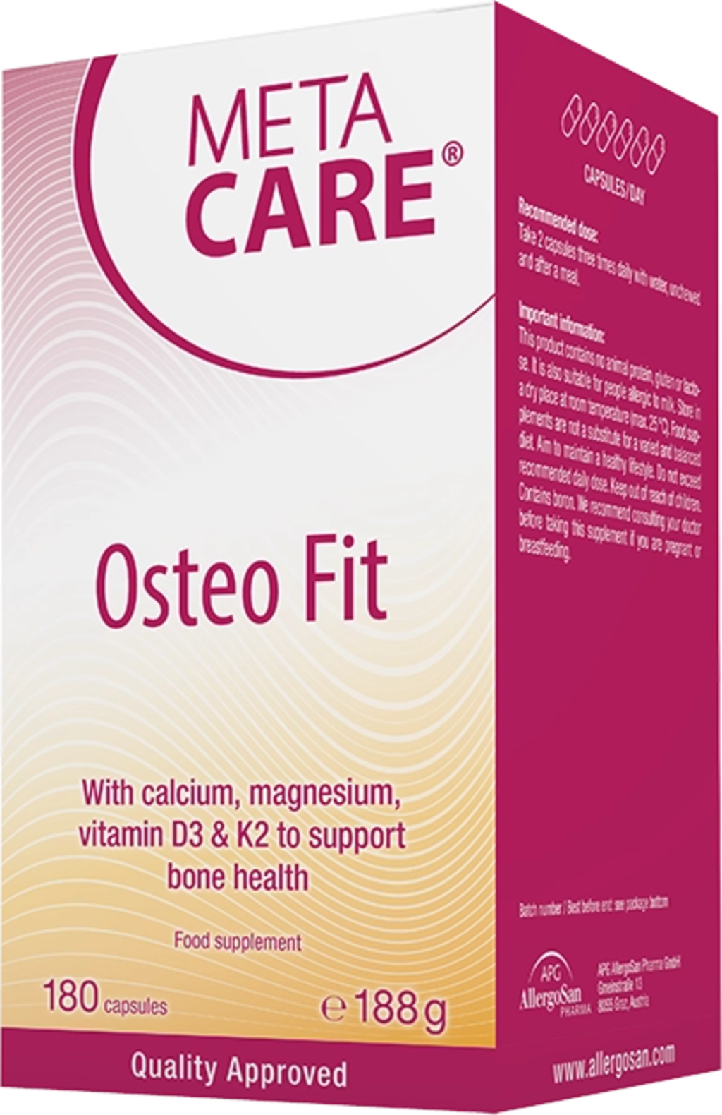 META-CARE® Osteo Fit capsules bevatten een voedingsstoffencomplex van essentiële botmineralen. De capsules bevatten plantaardig calcium uit rode algen, magnesium, vitamine D3, vitamine K2 en borium. De capsuleformule is vegetarisch en vrij van genetische manipulatie.