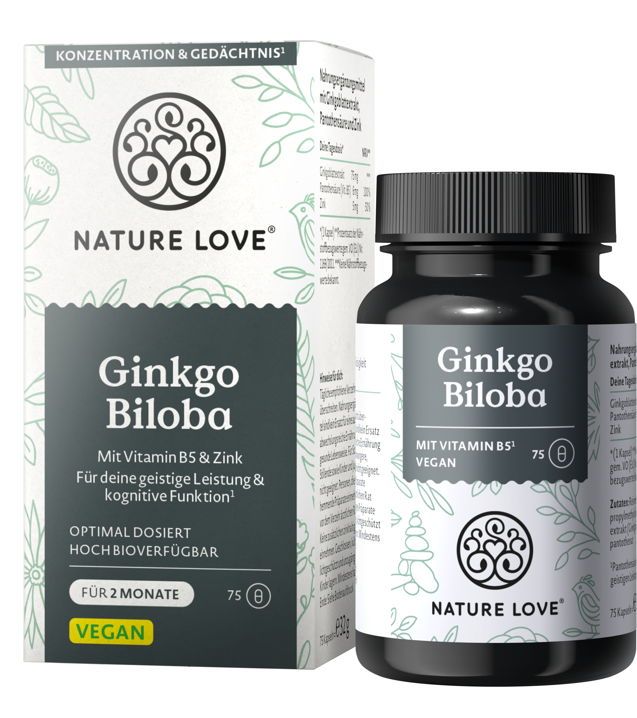 De Ginkgo Biloba capsules van Nature Love bevatten hoogwaardig, optimaal gedoseerd ginkgo bladextract. Daarnaast zijn de capsules verrijkt met vitamine B5 en zink. De capsules zijn 100% vegan en vrij van gluten en lactose.