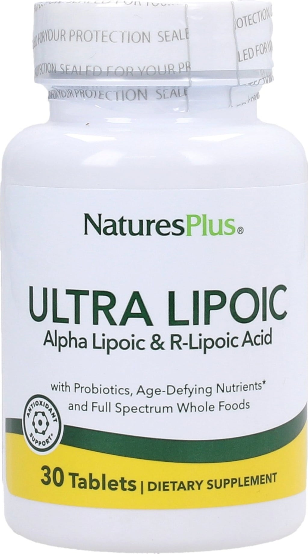 Nature's Plus ® Ultra-Lipoic™ levert 500 mg alfaliponzuur en nog eens 100 mg R-liponzuur. Daarnaast is er een probiotisch complex en whole food complex inbegrepen.