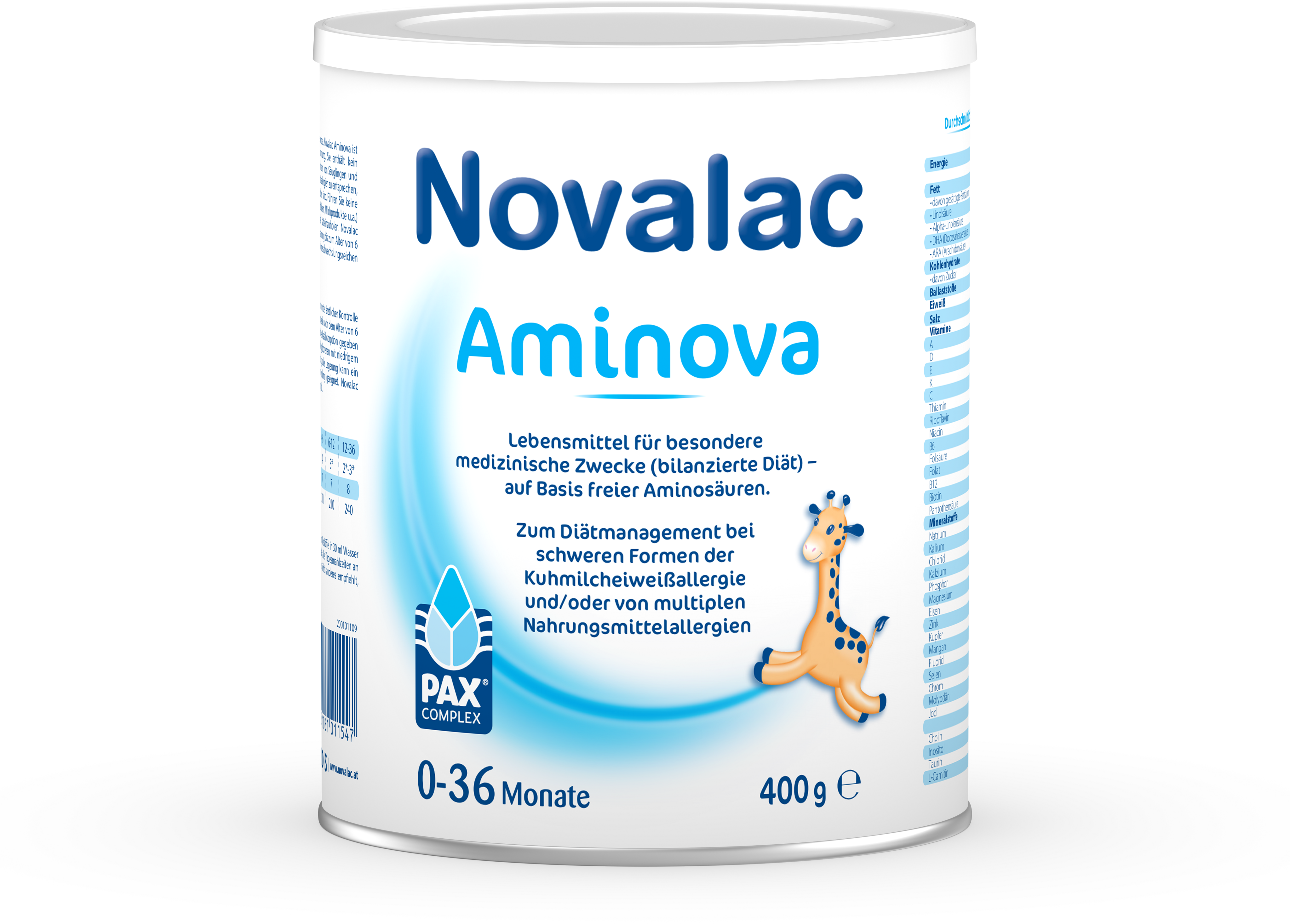 Novalac Aminova is een voeding voor baby's en kinderen met koemelkallergie of meervoudige voedselallergie. De voeding is bij uitstek geschikt voor baby's en kinderen van 0 - 36 maanden, waarbij Novalac Aminova ook gebruikt kan worden als enige voeding tot 6 maanden. Novalac Aminova is verrijkt met vrije aminozuren (aminozuurprofiel aangepast aan moedermelk) en LCP (DHA + ARA), belangrijke vitaminen, mineralen en een innovatief verdikkingsmiddel.