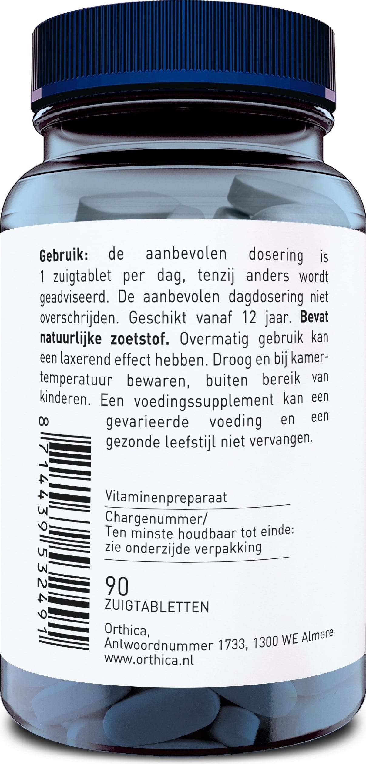 Orthica® B12 is een hooggedoseerde vitamine B12 (cyanocobalamine) in een handige zuigtabletvorm, ideaal voor onderweg en gemakkelijk in te nemen.