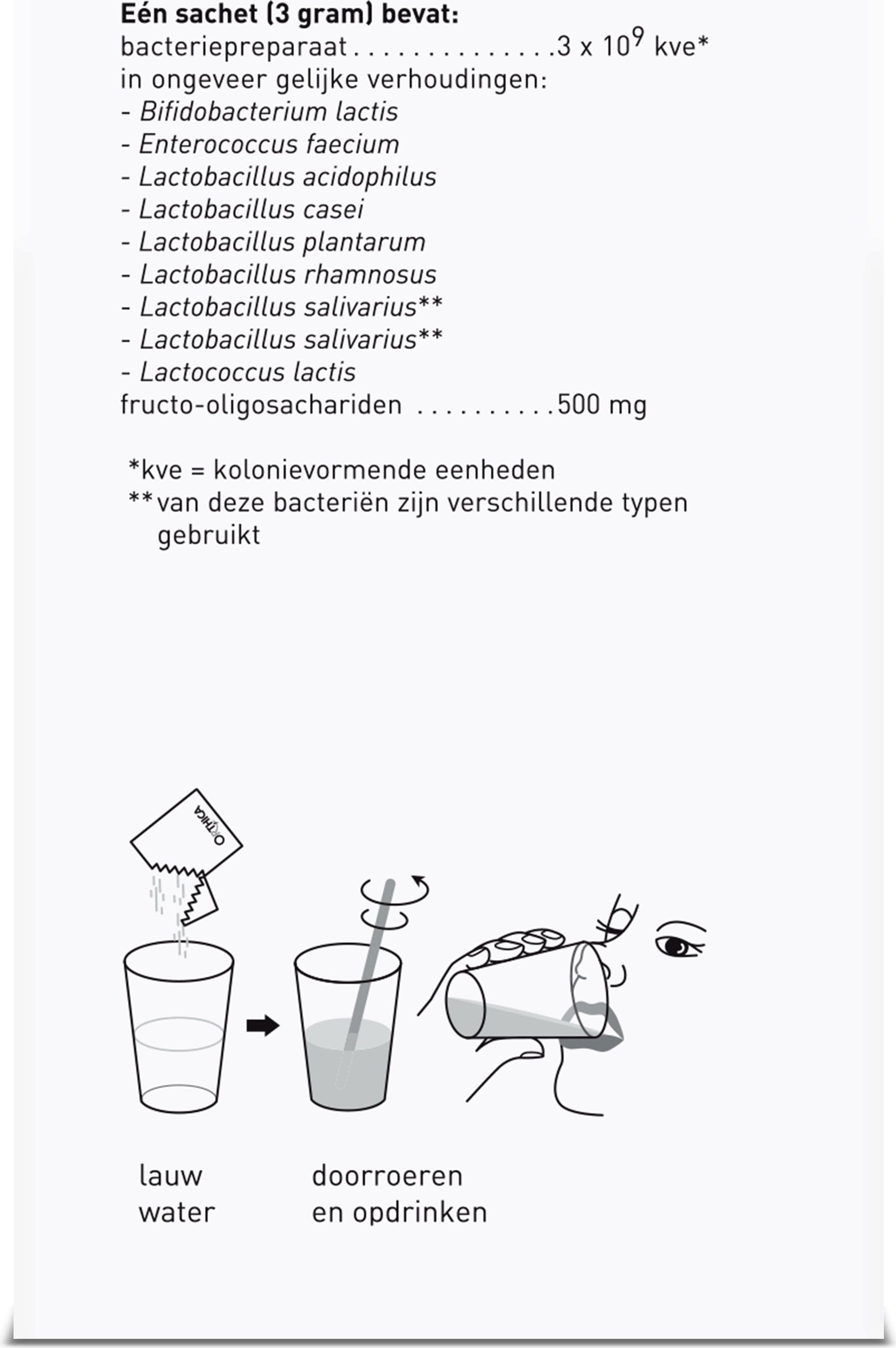 Eén sachet (3 g) bevat: Bacteriepreparaat 3,0 x 109 kve* in ongeveer gelijke verhoudingen