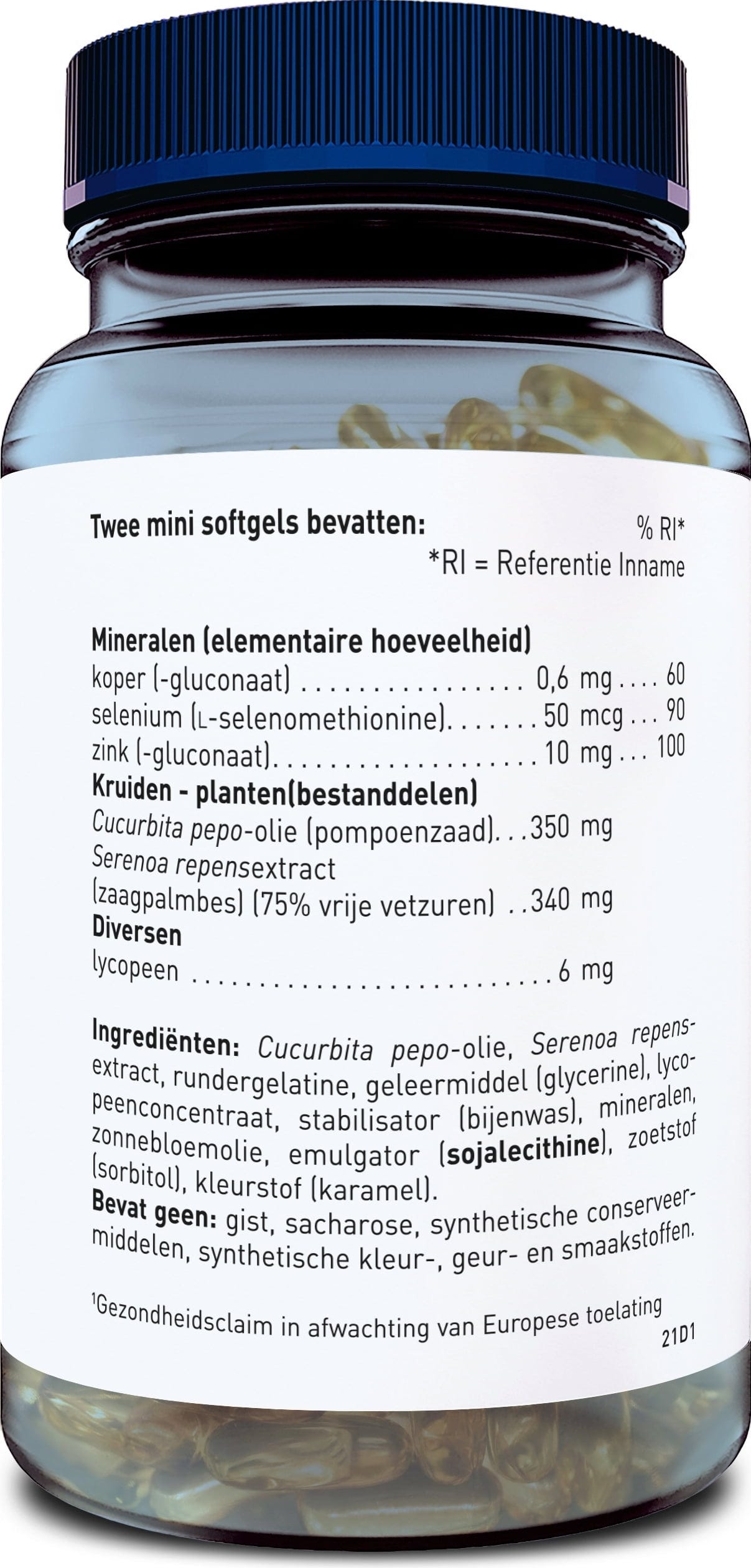 pompoenzaadolie, Sägepalmenextrakt, capsule (rundergelatine), Zinkgluconat, geleermiddel (glycerine), lycopeenconcentraat, Kupfergluconat, stabilisator (Bienenwachs, Sorbit), zonnebloemolie, emulgator (sojalecithine), kleurstof (Karamel), selenomethionine