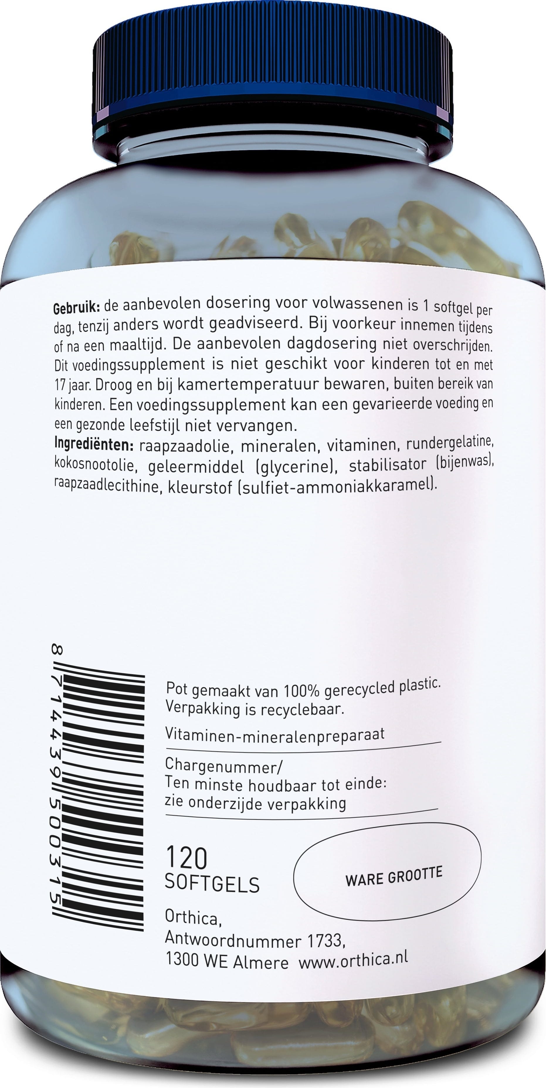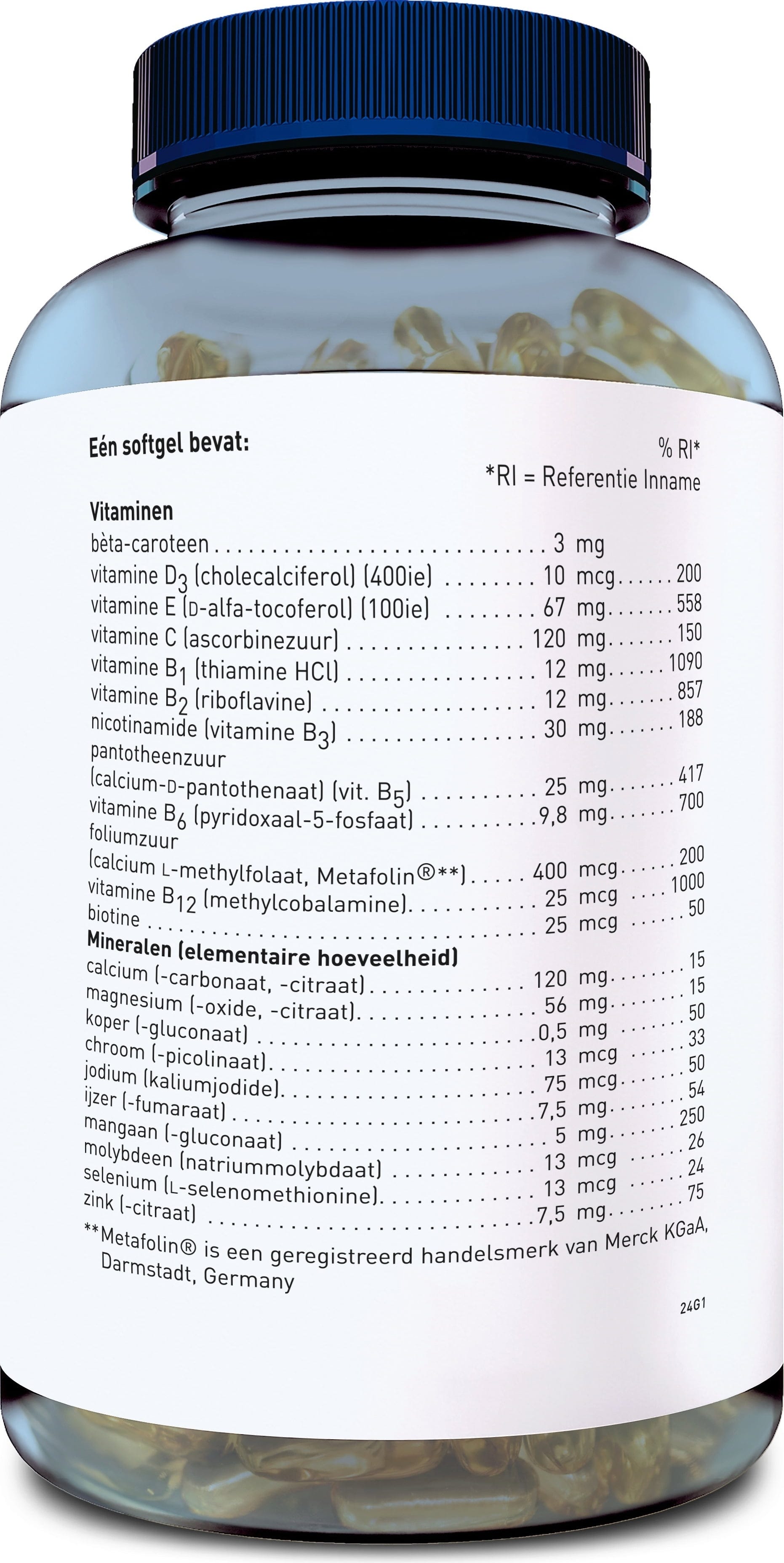 Koolzaadolie, capsule (rundergelatine), Calciumcarbonaat, kokosolie, geleermiddel (glycerine), L-Ascorbinsäure, D-Alpha-Tocopherol, Magnesium (als Oxid), stabilisator (Bienenwachs), Mangangluconat, koolzaadlecithine, nicotinamide, Vitamine B5 (calciumpantothenaat), zinkcitraat, ferrofumaraat, calciumzouten van citroenzuur, thiamine hydrochloride, Pyridoxal-5-Phosphat, magnesiumzouten van citroenzuur, riboflavine, Beta-Carotin, kleurstof (Karamel), Kupfergluconat, methylcobalamine, selenomethionine, calcium L-methylfolaat, Vitamin D3 (Cholecalciferol), kaliumjodide, chroompicolinaat, Natriummolybdat, biotine