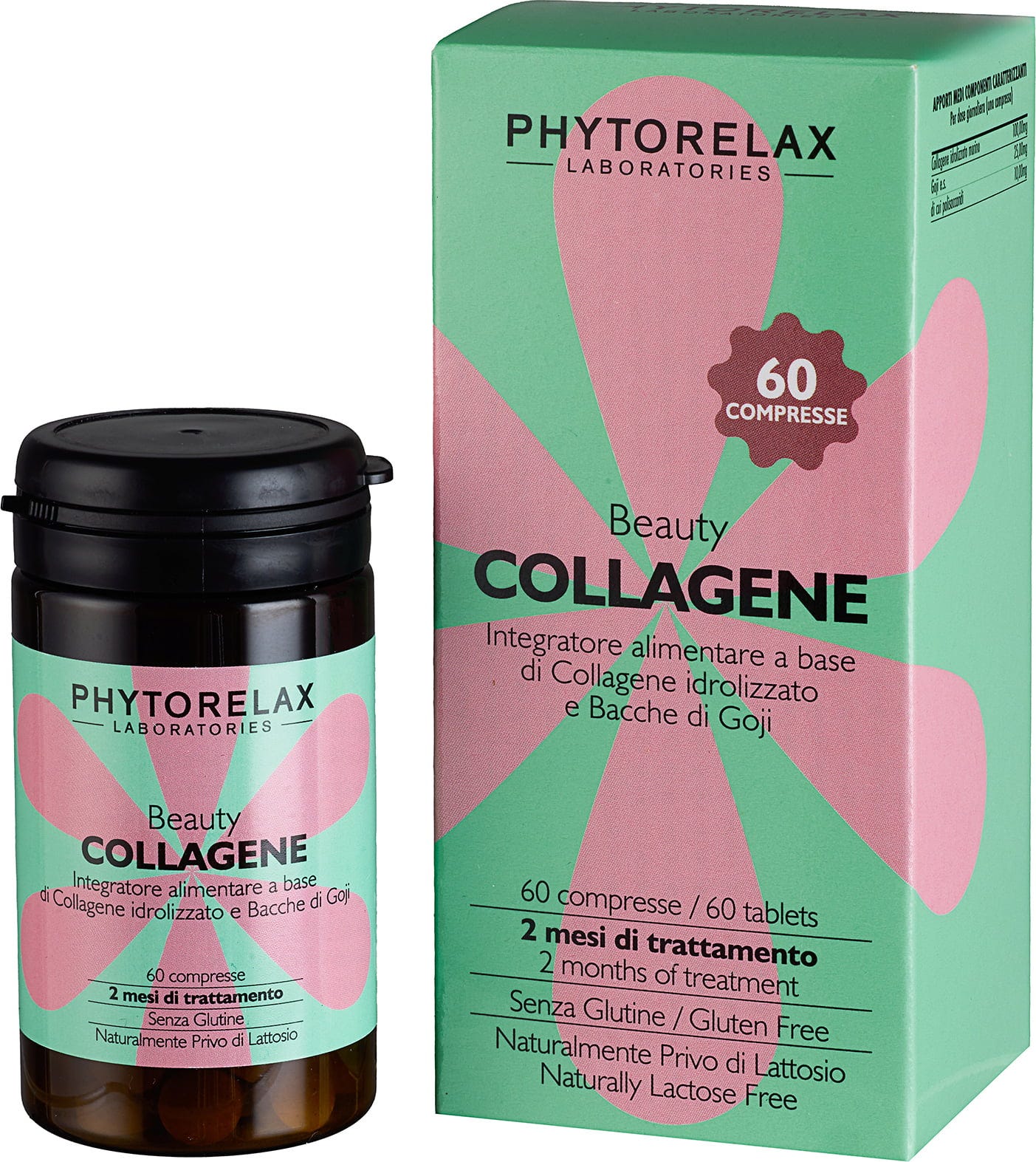 Phytorelax Beauty Collagene is een voedingssupplement in praktische tabletvorm op basis van gehydrolyseerd marien collageen en gojibessenextract. De formule is bewust gereduceerd, gluten- en lactosevrij en kan gemakkelijk worden geïntegreerd in je dagelijkse routine.