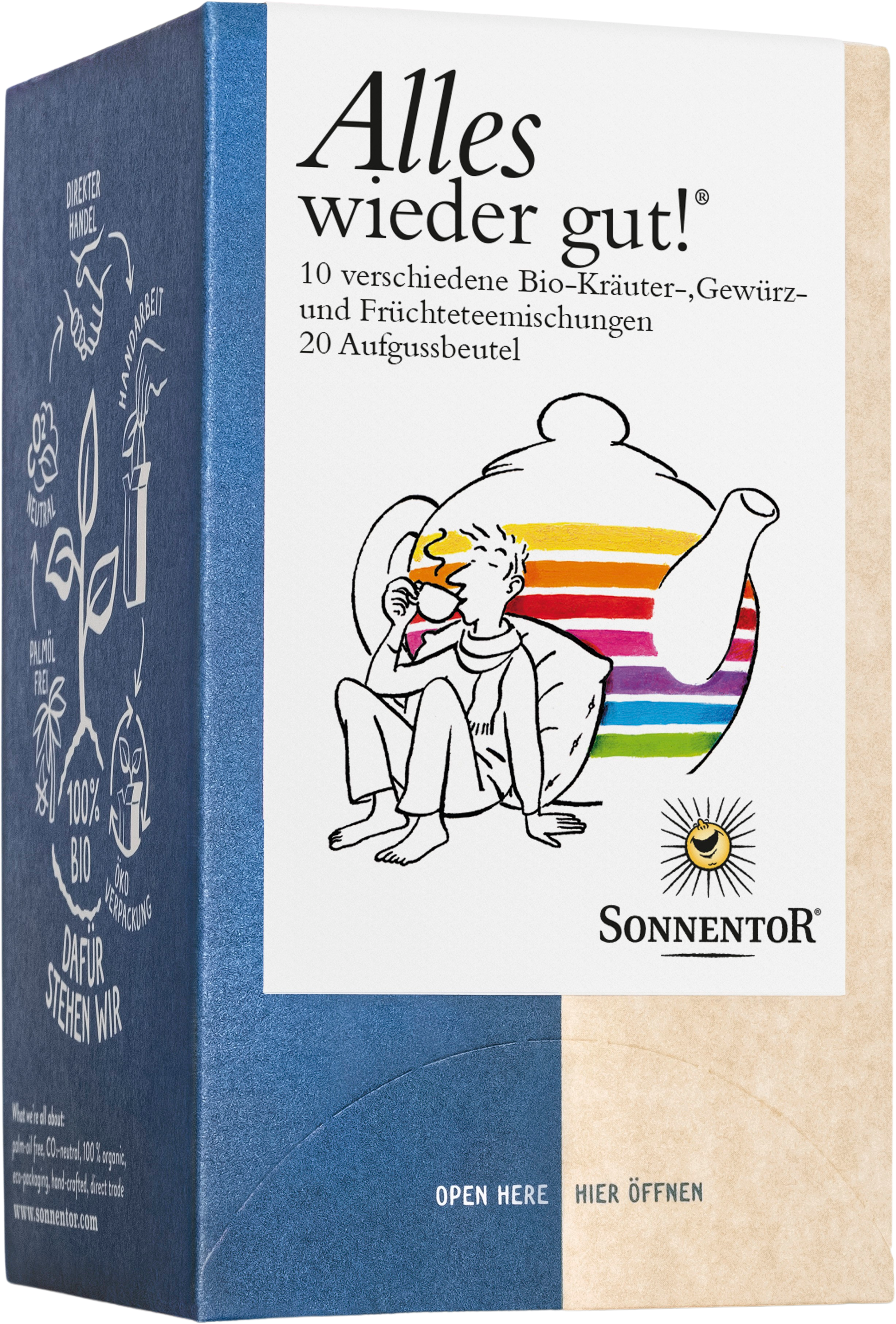 Alles is weer goed - met de 20 infuuszakjes heb je voor elke behoefte een sterke bondgenoot in je kopje: de aromatische biologische kruidentheemelanges van de Sonnentor "Alles is weer goed "-serie zetten dingen die fout zijn gegaan weer recht.