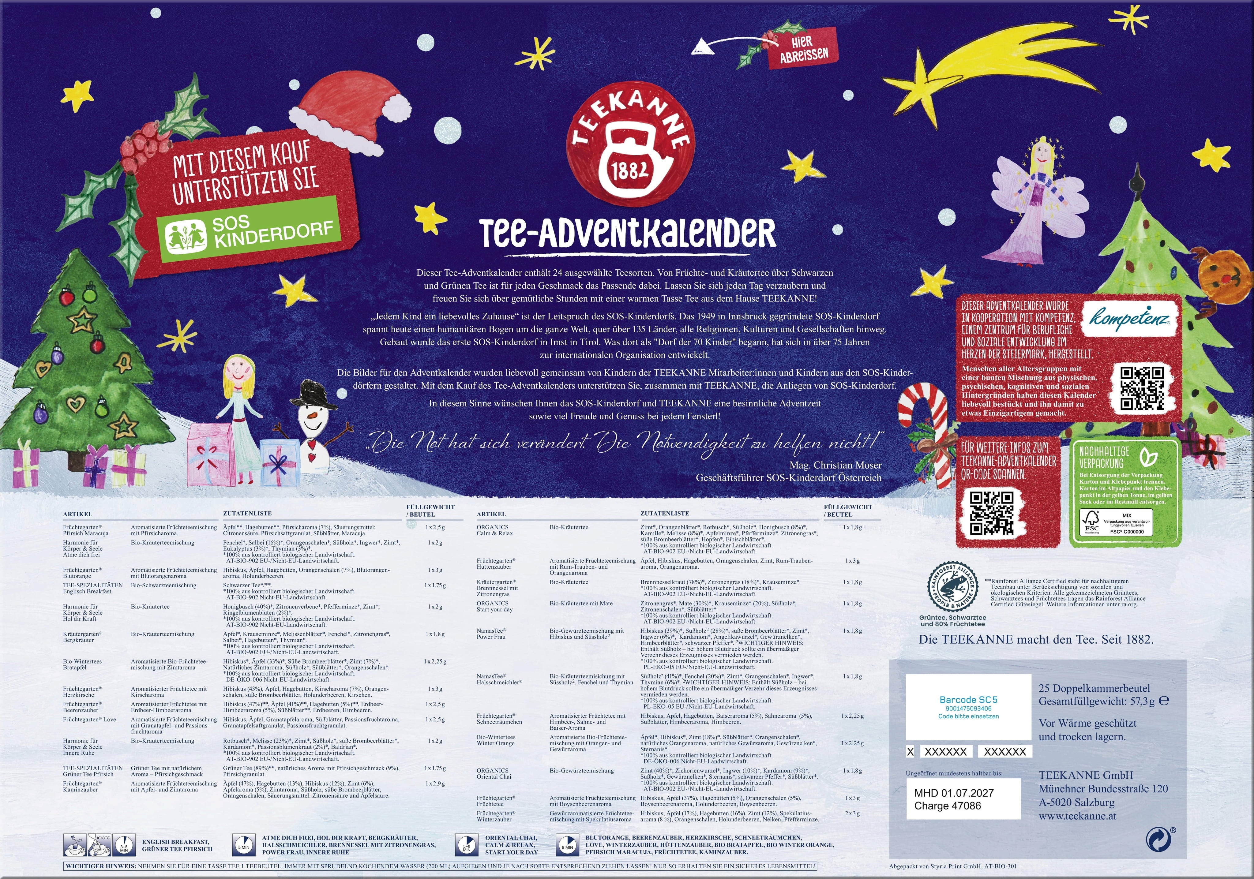 TEEKANNE heeft de adventskalender in samenwerking met SOS Kinderdorpen ontwikkeld. Door een adventskalender te kopen, steun je SOS Kinderdorpen.