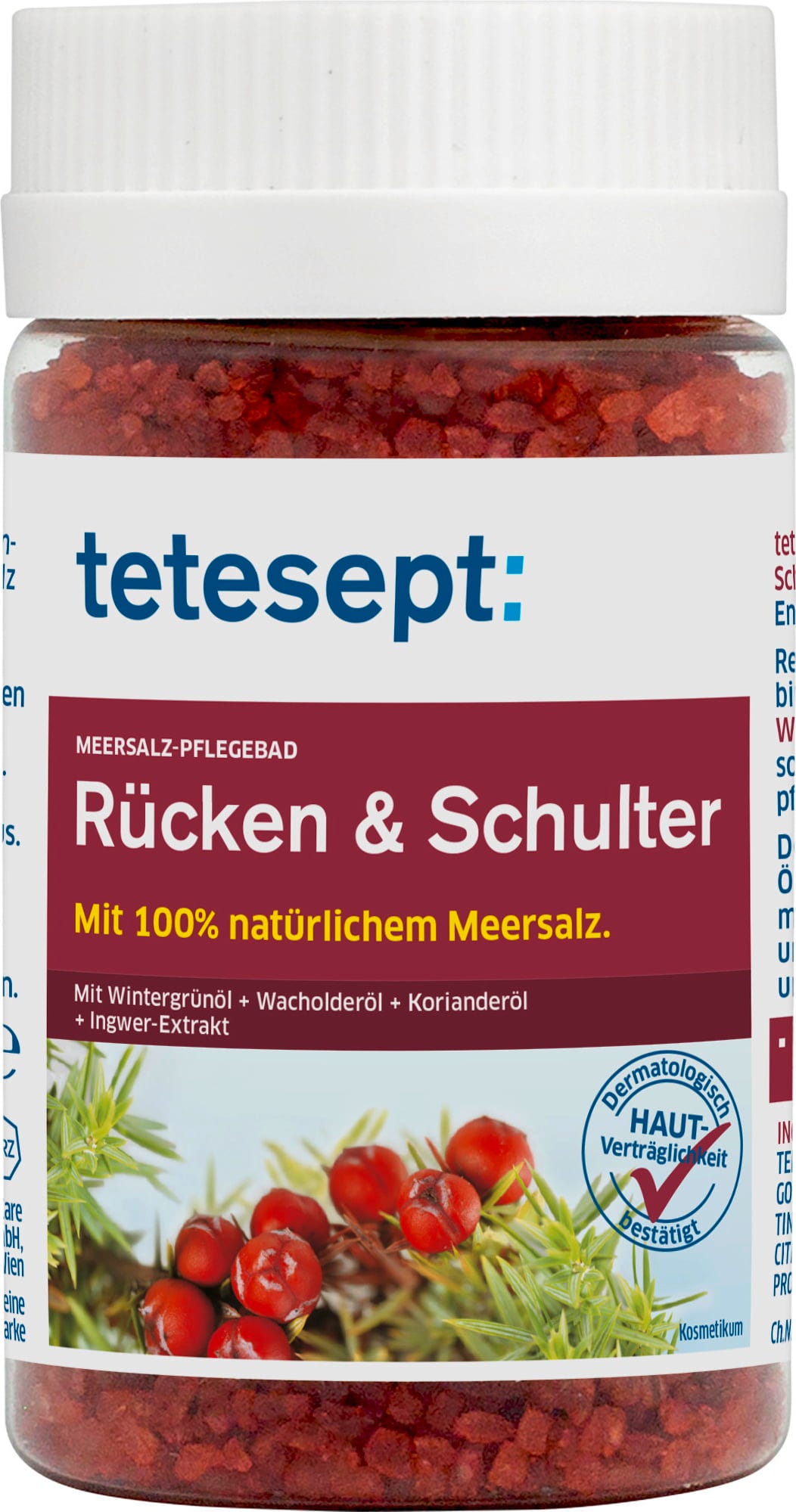 Een lange, inspannende dag kan je hele lichaam aantasten. Verwen je rug en schouders met dit badzout van tetesept! 100% puur natuurlijk zeezout, natuurlijke etherische oliën van wintergroen en jeneverbes en gemberextract veranderen je badkuip in de ideale plek om te ontspannen en tot rust te komen.
